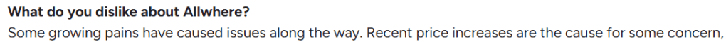 Despite its strengths, Allwhere has its share of limitations that can make it less appealing for many companies. Here are some common concerns raised by users: