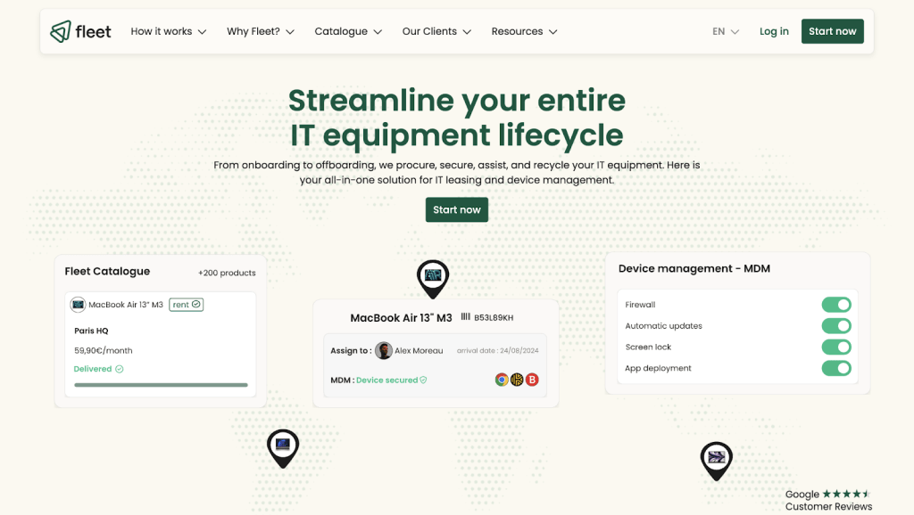 With 200+ products from laptops and phones to office furniture, it streamlines procurement through its Cockpit platform while offering real-time tracking, built-in MDM, and seamless app deployment. ISO-certified and sustainability-focused, Fleet appeals to companies looking for both security and flexibility.