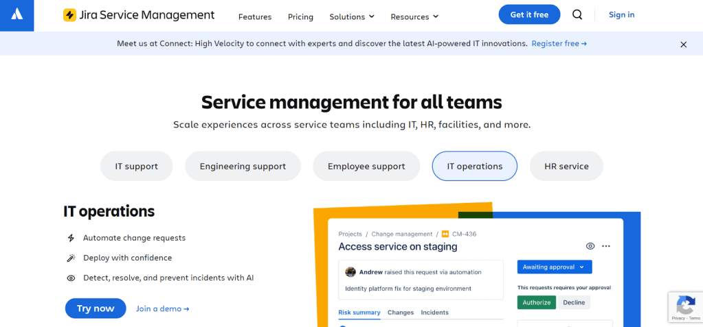 Jira Service Management is Atlassian’s ITSM platform built on Jira, designed for teams that want onboarding tightly connected to IT, HR, and development workflows. New hires submit requests through a self-service portal, while automated routing, approvals, and task assignments speed up setup. It works especially well for teams already using Jira, though the depth and flexibility can feel complex at first.