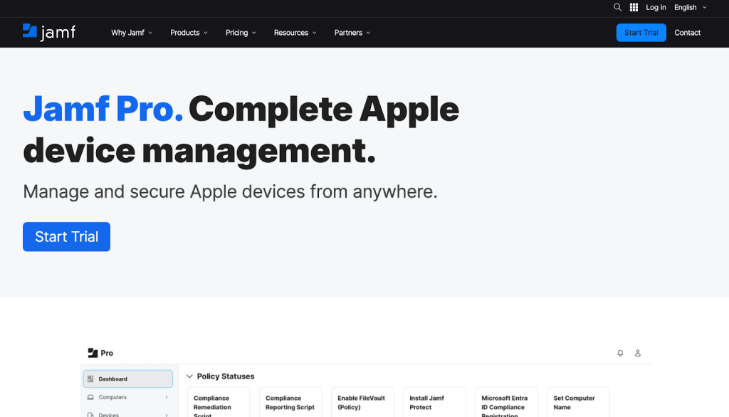 Jamf Pro is an enterprise-grade Apple device management solution trusted by organizations worldwide for deploying and managing Mac, iPad, iPhone, and Apple TV devices. The platform provides comprehensive deployment capabilities with policy-based management and extensive integration options.